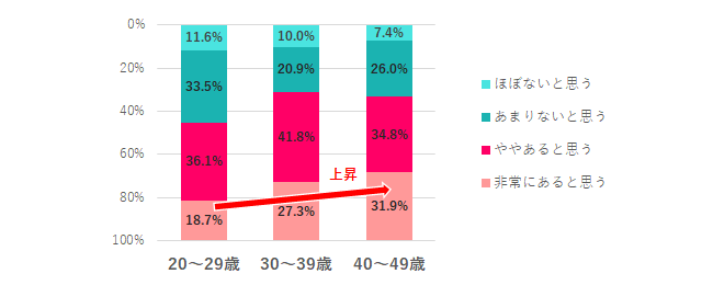 女性の回答について年代別に見てみると、ジェンダーギャップが「非常にある」は、年代が上がるごとに上昇。とくに40代は、3人に1人が「非常にある」と感じており、格差を強く感じていることがわかります。