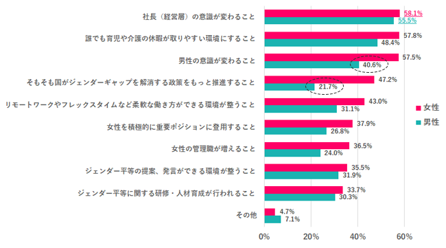 ただ、「男性の意識が変わること」と回答した人は、女性57.5%なのに対し、男性40.6%とギャップがあります。また「そもそも国がジェンダーギャップを解消する政策をもっと推進すること」については、女性は4位にランクインし47.2%の人が回答しているのに対し、男性は21.7%と2倍以上の開きがあります。「リモートワークやフレックスタイムなど柔軟な働き方ができる環境が整うこと」や「女性を積極的に重要ポジションに登用すること」も女性と男性で10%以上の開きがあり、意識の違いが現れる結果となりました。
