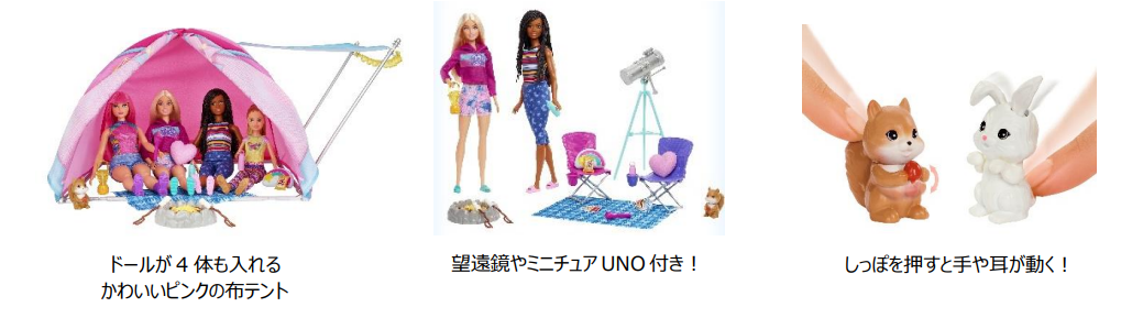 Netflixで日本語アニメが配信中の『バービー・イット・テークス・トゥー』に登場する、二人のバービー「マリブ」と「ブルックリン」とアウトドアアドベンチャーが楽しめるキャンプセットです。ピンクの布テントはバービードールが4体も入るほどの大きさで、その入り口にはイルミネーションを演出するライティングがついています。焚火の周りに折りたたみ椅子を並べて、マシュマロを焼いたりカードゲームの『UNO』で遊んだり、望遠鏡を使って夜空の星を見て楽しむことができ、かわいいキャンプウェアを着た『マリブ』と『ブルックリン』と本物さながらのキャンプ体験ができます。さらに、付属のうさぎとりすのドールは、しっぽを押すと、うさぎは耳が動き、りすはドングリを食べるしぐさをするというキュートなギミック付きです。