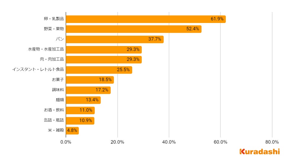 特に値上げされていると感じる食品は「卵・乳製品」が最も多く61.9%、次いで多かった回答は