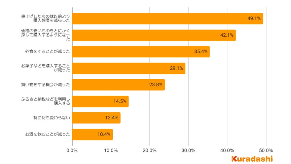 最も多かったものは「値上げをしたものは以前より購入頻度を減らしたが」で49.1%、次いで「価格の安いものをとにかく探して購入するようになった」で42.1%でした。各家庭が工夫してお買い物をしていることが読み取れます。