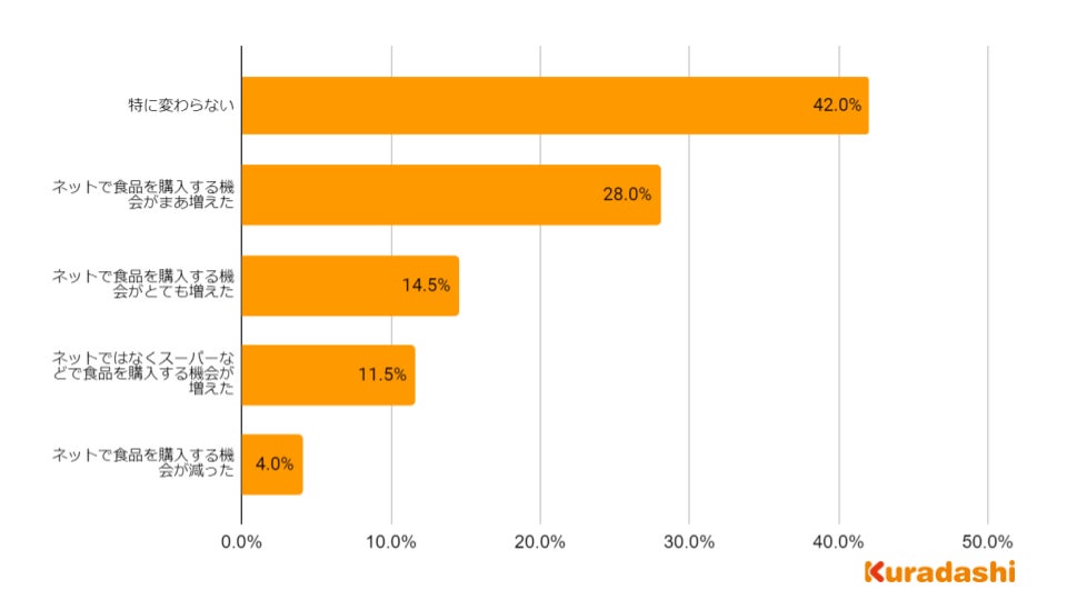 オフラインでの活動が増えた2023年ですが、インターネットで購入する機会は「特に変わらない」と回答した方が最も多く42.0%でした。さらに「ネットで食品を購入する機会が減った」方は4.0%でした。新型コロナウイルス感染拡大にかかわらず、日頃からインターネットで食品を購入する方が一定数いることが読み取れます。