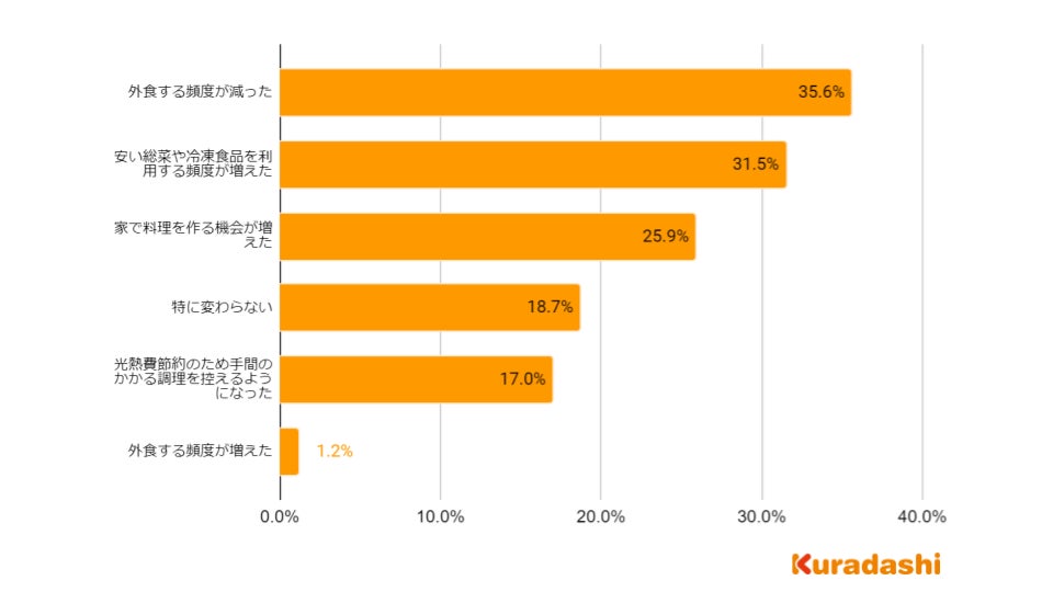 食生活の変化として「外食する頻度が減った」と回答した方が最も多く35.6%でした。次いで「安い総菜や冷凍食品を利用する頻度が増えた」が31.5%、「家で料理をする機会が増えた」が25.9%でした。
