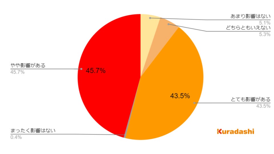 「とても影響がある」と回答した方が43.5%、「やや影響がある」と回答した方が45.7%で、回答者全体の89.2%が家計への影響を感じているという結果でした。