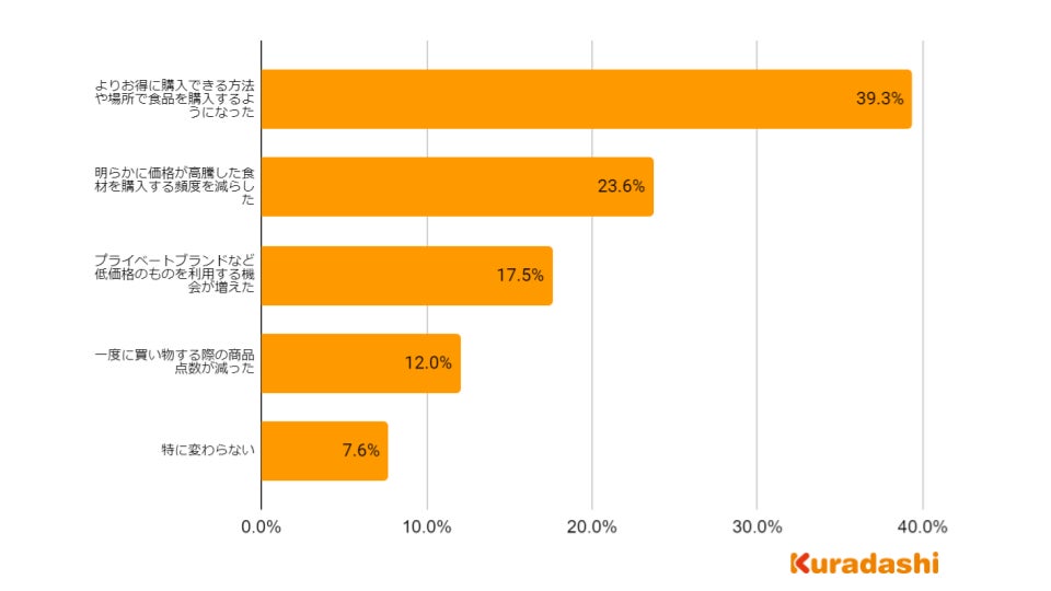 「よりお得に購入する方法や場所で食品を購入するようになった」と回答した方が39.3%、「明らかに価格が高騰した食材を購入する頻度を減らした」と回答した方は23.6%となりました。お買い物する場所、頻度を工夫している方が多いことが読み取れます。