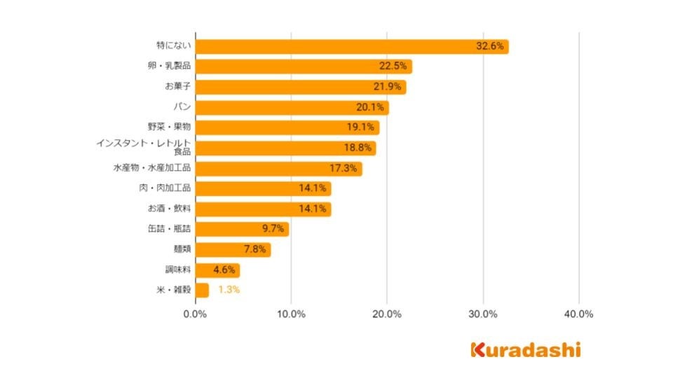 「購入を控えるようになったものはない」という回答が最も多く32.6%でしたが、調査結果6で値上げされていると回答した方が多い「卵・乳製品」、「パン」、「お菓子」はそれぞれ20%前後の人が購入を控えるようになったと回答しています。
