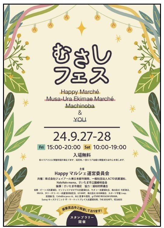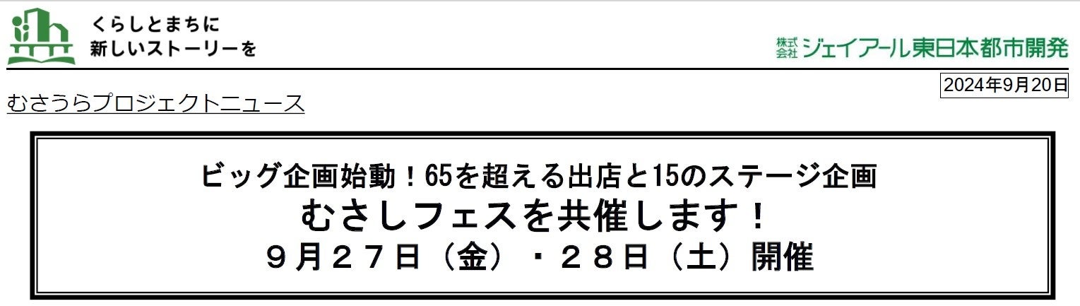 株式会社ジェイアール東日本都市開発は、2024年9月27日(金)・28日(土)に開催される「むさしフェス」(主催:Happyマルシェ運営委員会)を共催し、様々な地域の方と共に武蔵浦和エリアを盛り上げてまいります。