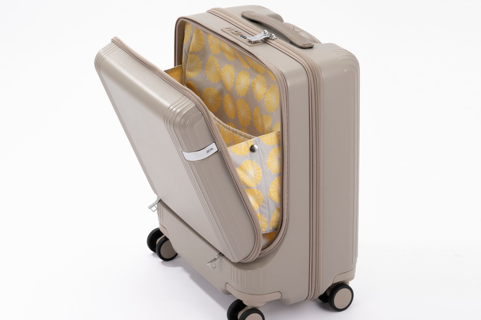 No.05321はスーツケースを⽴てたまま、フロントポケットに⼊れた荷物をスムーズに取り出すことができます。