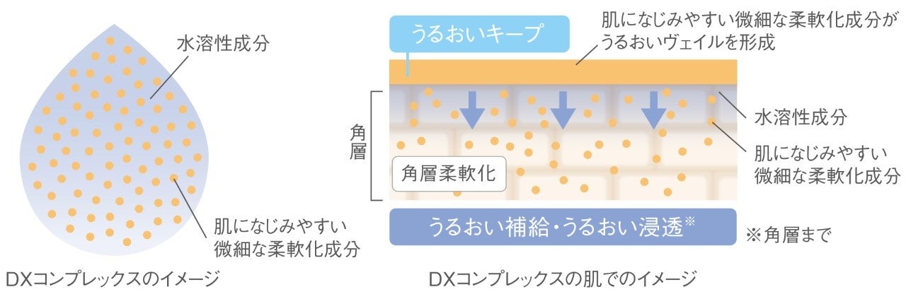 「肌になじみやすい微細な柔軟化成分」や「水溶性成分」が、厚く硬くなった角層に、素早く浸透します。また、「肌になじみやすい微細な柔軟化成分」が肌表面にうるおいヴェイルを形成することで、うるおいをキープしながら乾燥を防ぎます。