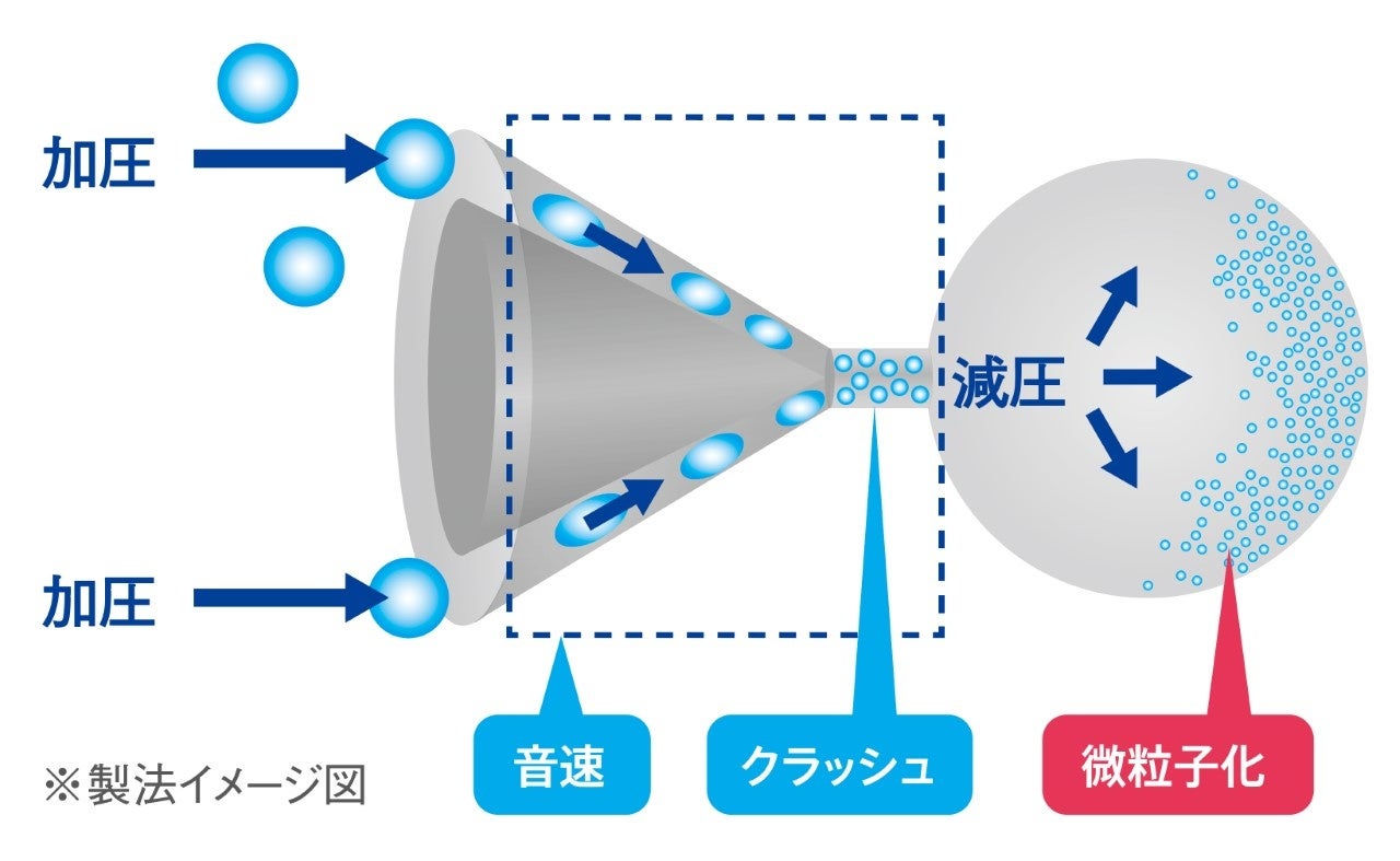 液状のものに音の伝達スピードと同じ高速で衝撃を与え、当社内での通常乳化の200分の1のサイズにまで微粒子化できる技術で製造された「音速クラッシュ処方」を採用。微粒子化技術により微細な成分が肌へ浸透します(※角層まで)。