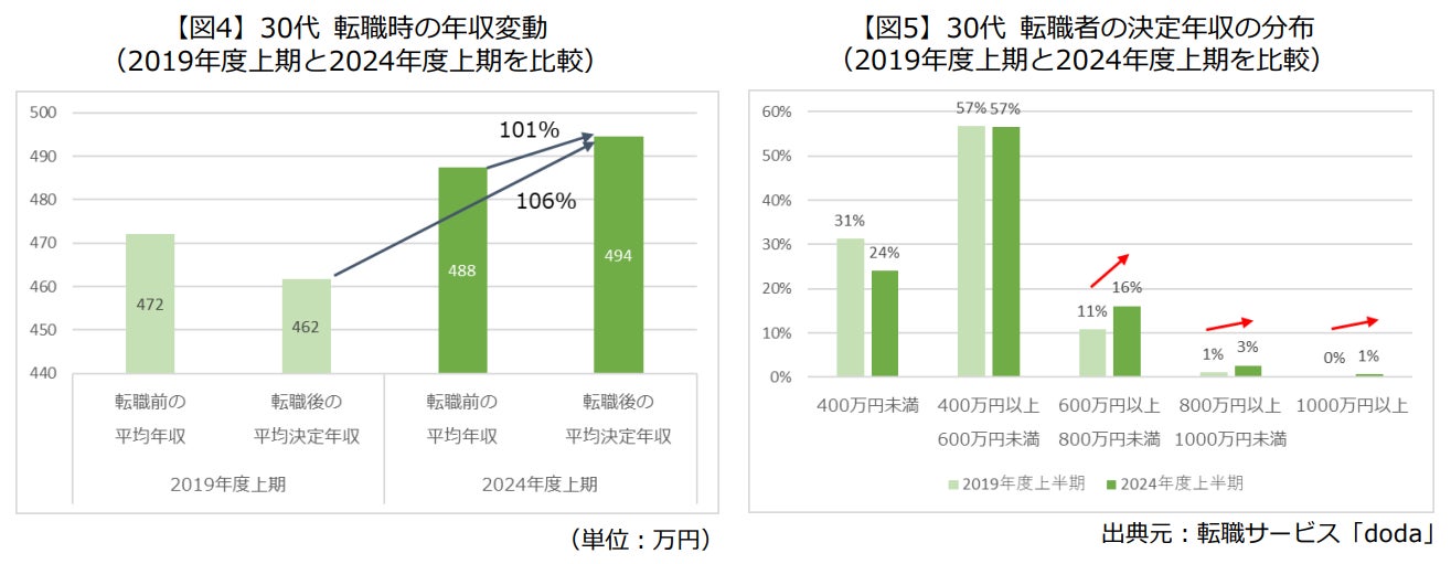 30代転職者の転職時の年収変動をみると、2019年度上期は減少、2024年度上期は101%と微増しました(図4)。なお、平均決定年収額は2019年度上期比で106%アップしています。決定年収の分布をみると、ボリュームゾーンである「400万円以上~600万円未満」の割合は変わらないものの、600万円以上の割合が計8%増えました(図5)。