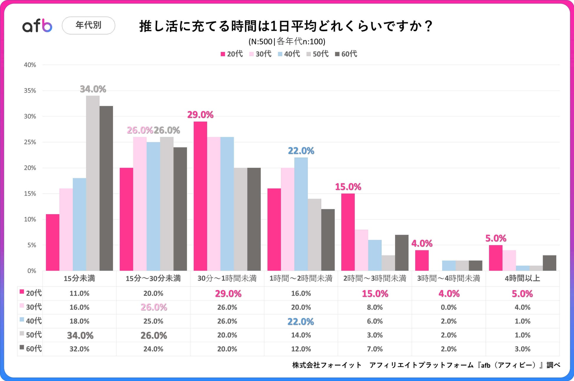 アフィリエイトプラットフォーム「afb(アフィビー)」< https://www.afi-b.com/ >の開発運用をおこなう株式会社フォーイットは、全国の20代~60代までの男女500人を対象に推し活に関するアンケートを実施し、年代別等の特徴についてまとめました。