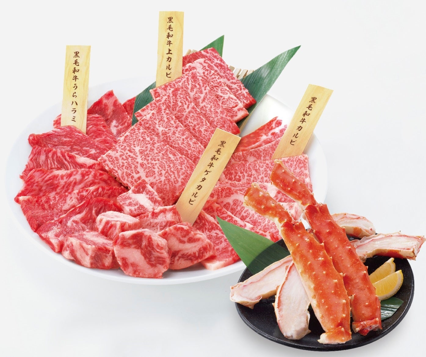 厳選された黒毛和牛の盛り合わせに大ぶりなタラバガニが2本(ハーフ4本)付いたお得なセット。約3~4人前。