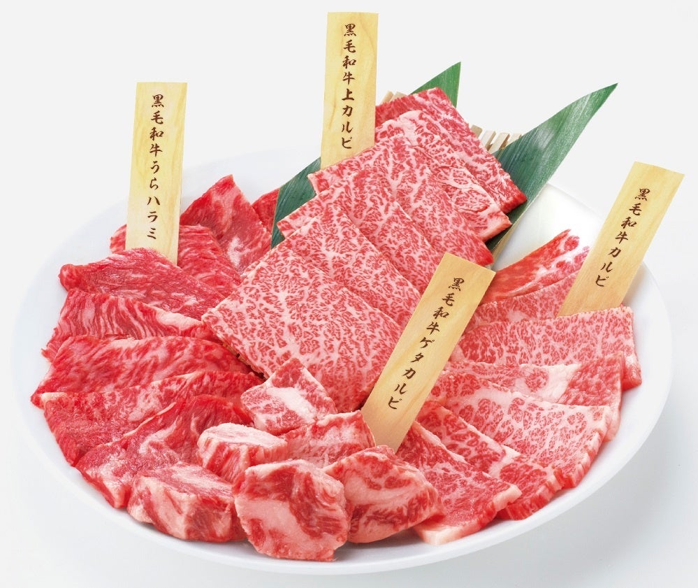 綺麗な霜降りが口の中でとろける「黒毛和牛上カルビ」、濃厚で深みのある美味しさの「黒毛和牛カルビ」、和牛カルビのような甘みとハラミのようなやわらかい食感の「黒毛和牛うらハラミ」、骨の髄から出る旨みを味わえる「黒毛和牛ゲタカルビ」の4種が盛り合わせ。それぞれ違った表情を持つ和牛をお楽しみください。
