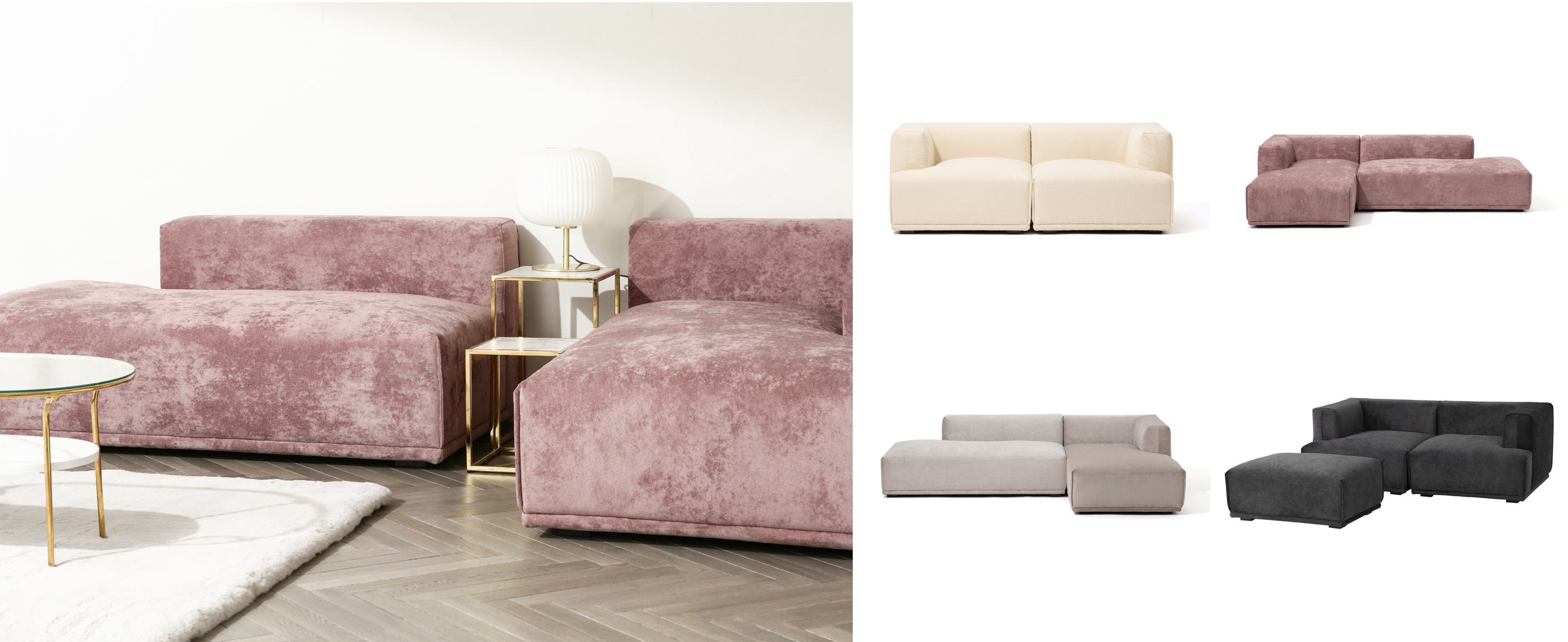 自分好みにカスタマイズできる「メーネ」シリーズです。カウチの向きを左右で選んだり、同じソファを並べたり、お部屋の間取りやライフスタイルに合わせて設置できます。背もたれが低めなので、圧迫感がなく部屋を広く見せてくれるのもポイント。少しツヤのある光沢感が落ち着いた印象を与え、しっとりソフトな肌触りの起毛生地で、より快適なリラックスタイムを過ごしていただけます。低めの座面高に適したクッションを採用し、表面生地の下にフェザーの層と固めのウレタンフォームの層を設けることで、硬過ぎず柔らか過ぎない座り心地に仕上げています。奥行きがあり寛げるサイズ感にマッチしたクッション性をお楽しみいただけます。