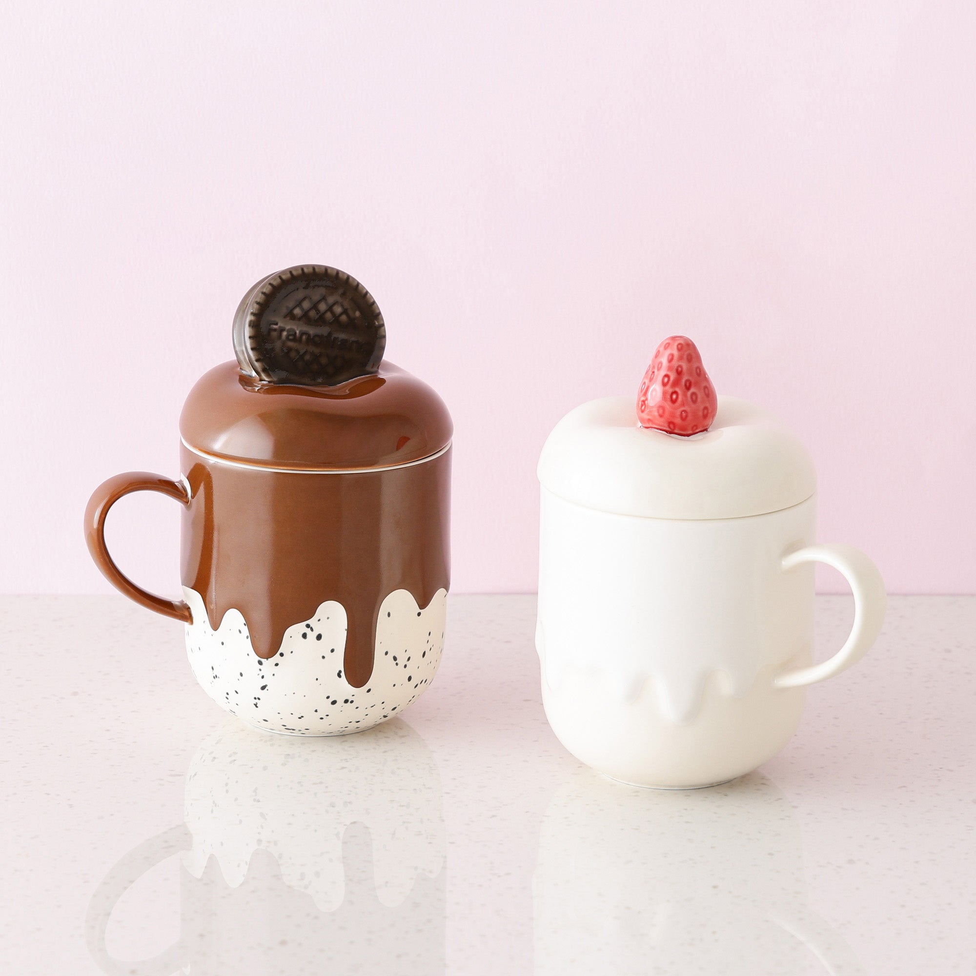 カップケーキをモチーフにしたデザインのマグカップです。ホワイトは、生クリームが垂れている王道のショートケーキ風デザインで、トップのイチゴがアクセントです。ブラウンは、チョコがたっぷりかかったスイートなデザインで、スポンジ部分のチョコが練りこまれたようなスプラッター柄がポイントです。本物のケーキが入っていそうなボックスもこだわりポイント。ギフトにぴったりのアイテムです。クリスマスパーティーや女子会で活躍します。