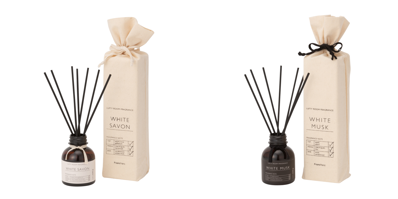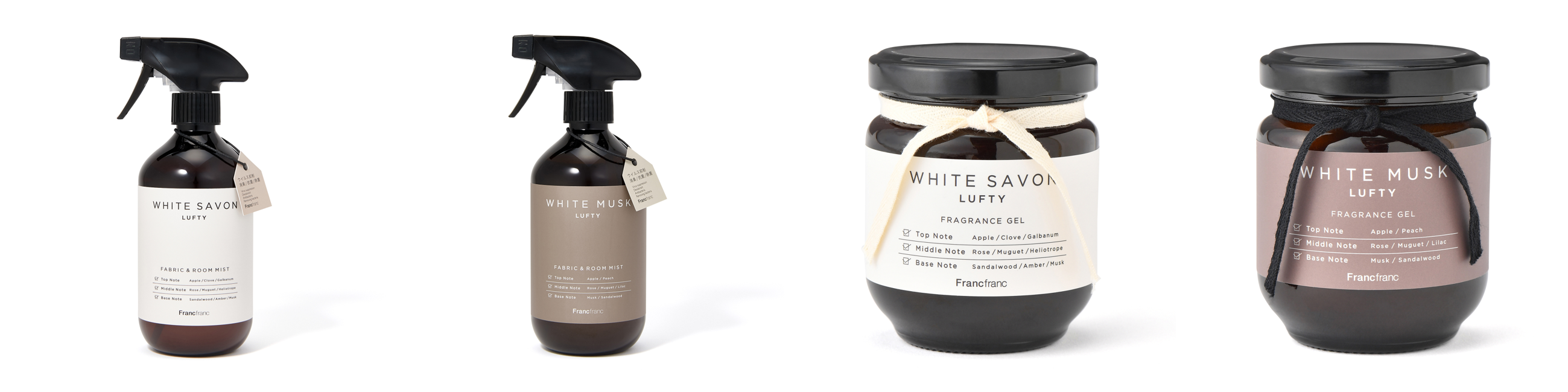 植物性消臭成分配合のフレグランスシリーズです。香りは、ほんのり甘くまろやかで大人っぽいムスクの香りと、洗い立てのリネンのような清涼感のある爽やかなサボンの香りの、2種類をラインアップ。気になる臭いを消臭しながら、心地よい香りを楽しめて、お部屋を素敵な空間へと導きます。ナチュラルで洗練されたデザインで、お部屋に馴染みやすいのもポイント。ルームフレグランスは、ボトルが樹脂製なので丈夫で割れる心配がなく、フレグランスジェルはコンパクトサイズなので、お風呂やお手洗い等の狭くて動きの多い場所で活躍します。ファブリックミストは、衣類やカーテン、ソファなどの布製品や、お部屋や車内の気になるにおいなど、様々なシーンでお使いいただけます。