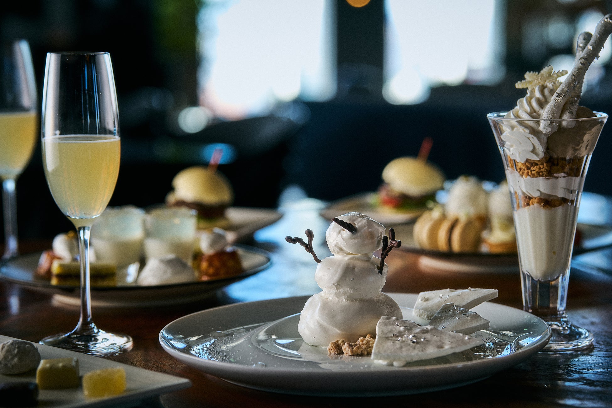 きらめく雪をイメージし、パティシエの趣向を凝らした可憐なスイーツが並ぶバラエティデザートでは、濃厚に仕上げたレアチーズムースやカモミールの香るパンナコッタなど4種の味わいをご堪能いただけます。そして、メインでご用意するグランデセールでは、メープルとコーヒーの2種類のアイスを乗せた「ホワイトパフェ」または、シャンティクリーム・ヨーグルトとマスカルポーネのアイス・フロマージュブランのムースを3段に重ね、チョコレートの鼻と手をあしらった「ゆきだるま」のどちらかをお選びいただけ、見た目にも冬の季節を感じられる楽しさをテーブルの上で演出いたします。