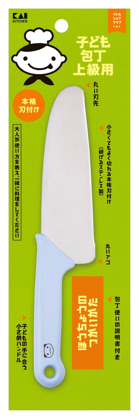本格的なつくりの子ども包丁。アゴと刃先を丸くした、けがをしにくい構造です。