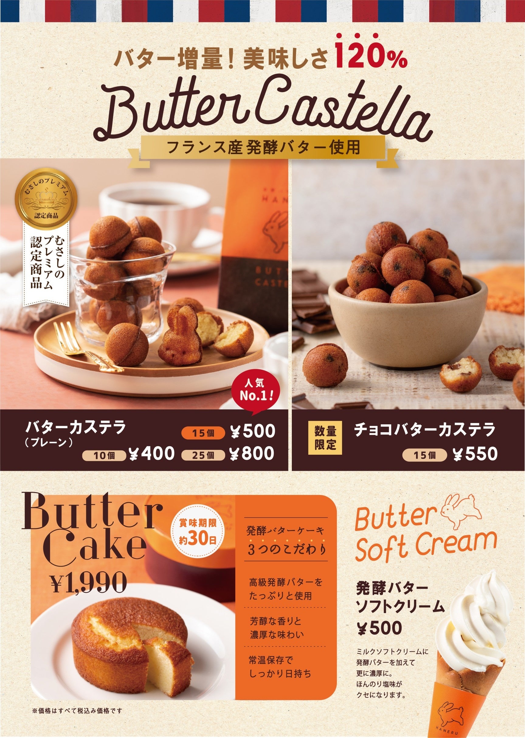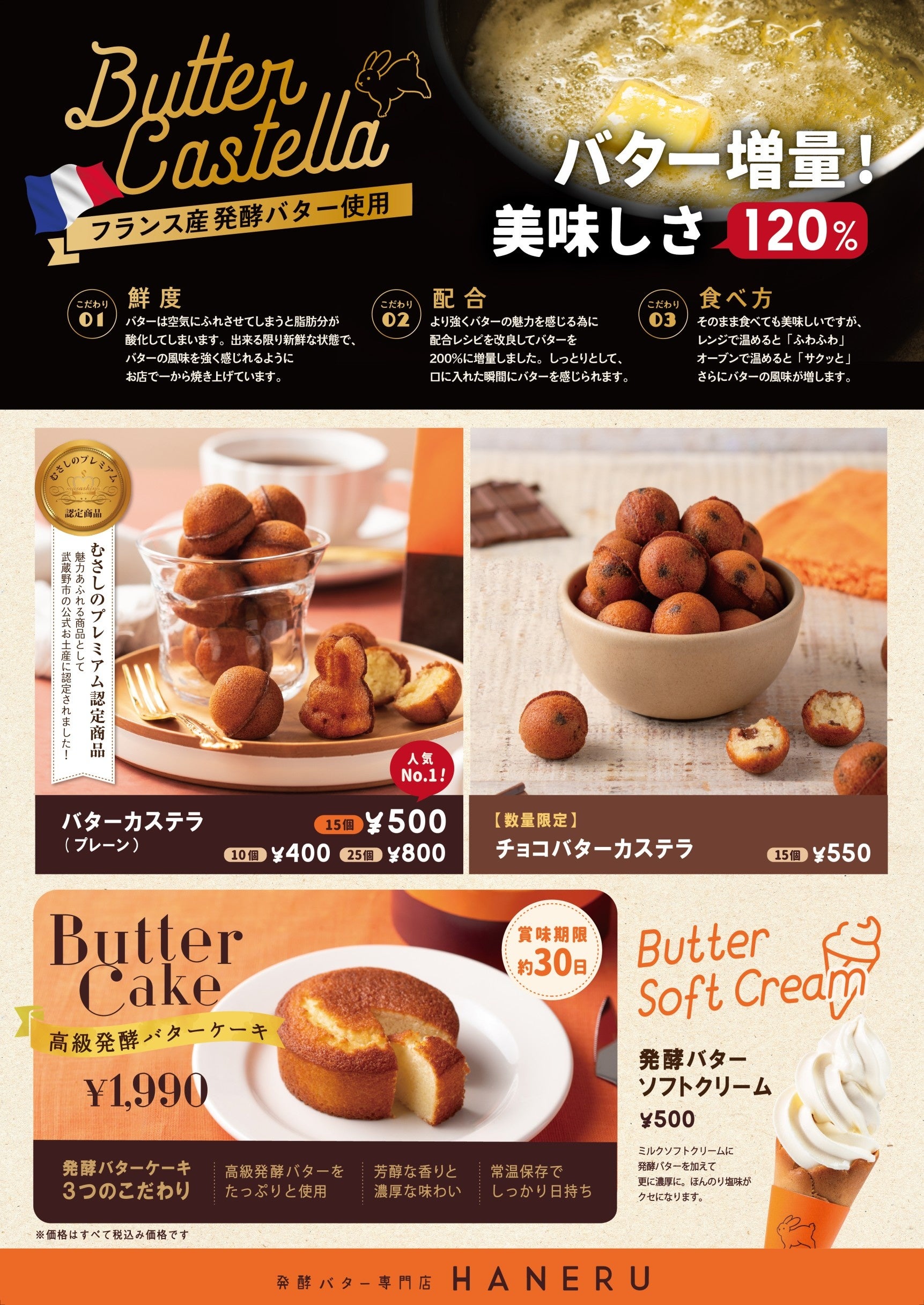 「発酵バター専門店HANERU」では、人気No1商品【バターカステラ】のバターを大幅に増量。