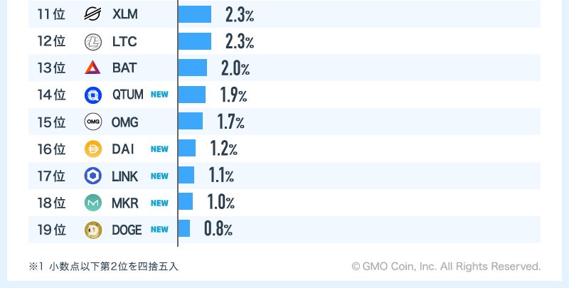 また、ビットコイン(BTC)、イーサリアム(ETH)を含む上位5銘柄はいずれも当社での取扱期間が長い銘柄となっており、それにネム(XEM)が続く形となっています。
