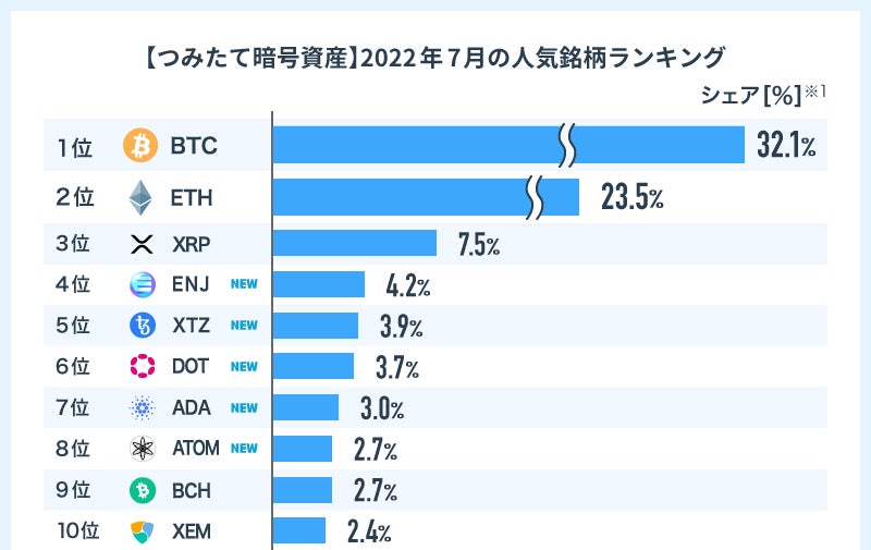 最新の人気銘柄はビットコイン(BTC)がシェア32.1%で1位、次いでイーサリアム(ETH)がシェア23.5%で2位となり、この2銘柄で「つみたて暗号資産」サービスの50%以上のシェアを占める結果となりました。