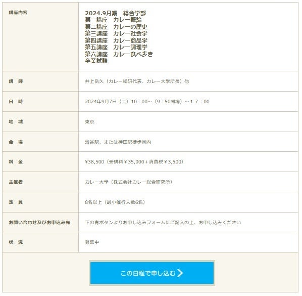 希望者は急いでください。1名のみですので、すぐに満席になります。テレビや新聞など多くのマスコミで紹介されている信頼と実績のある学校です。カレー業界関係者がカレーの基本から応用までを学ぶ専門機関です。