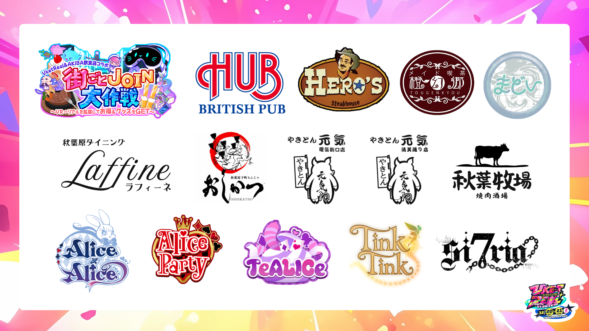 VketReal 2025 Winterでは、秋葉原の人気飲食店14店舗とコラボし、会場内にとどまらず街全体でバーチャル⇔リアルを楽しめる企画「VketReal×AKIBA飲食店コラボ『街ごとジョイン大作戦!』~VR⇒リアルを拡張してお得&グッズをGET~」を開催します。コラボ店舗では、VketReal有料エリアのリストバンド提示で利用できる割引や特典に加え、リストバンドがなくても楽しめるお得なコラボメニューやオリジナルグッズなど、多彩な特典をご用意しています。また、本企画に合わせて描き下ろしデザインのステッカーやコースターも多数登場します。