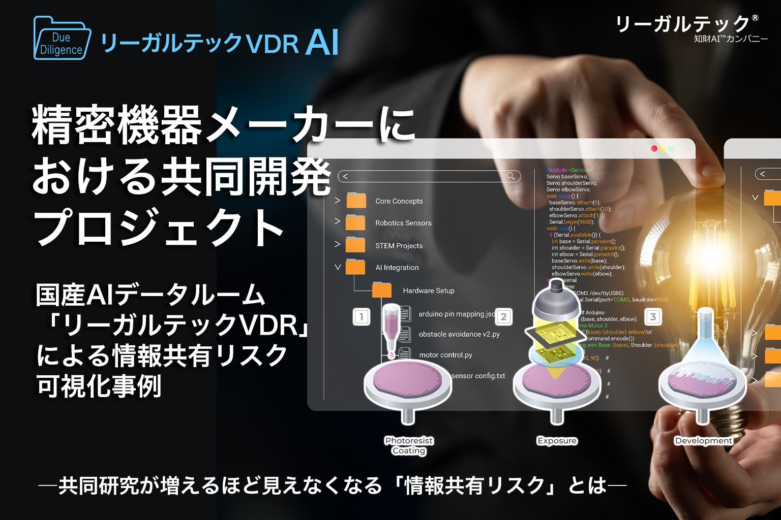 リーガルテック株式会社(本社:東京都港区、代表取締役社長:平井智之)は、精密機器メーカー(企業名非公開)の開発部門において、共同開発プロジェクトにおける情報共有リスクの可視化と開示コントロールの高度化を目的に、AI活用型バーチャルデータルーム(VDR)「リーガルテックVDR AI」が初導入された事例を公開した。