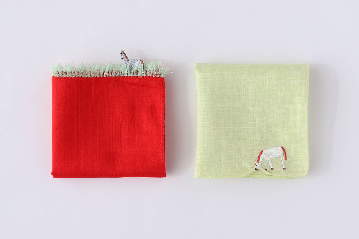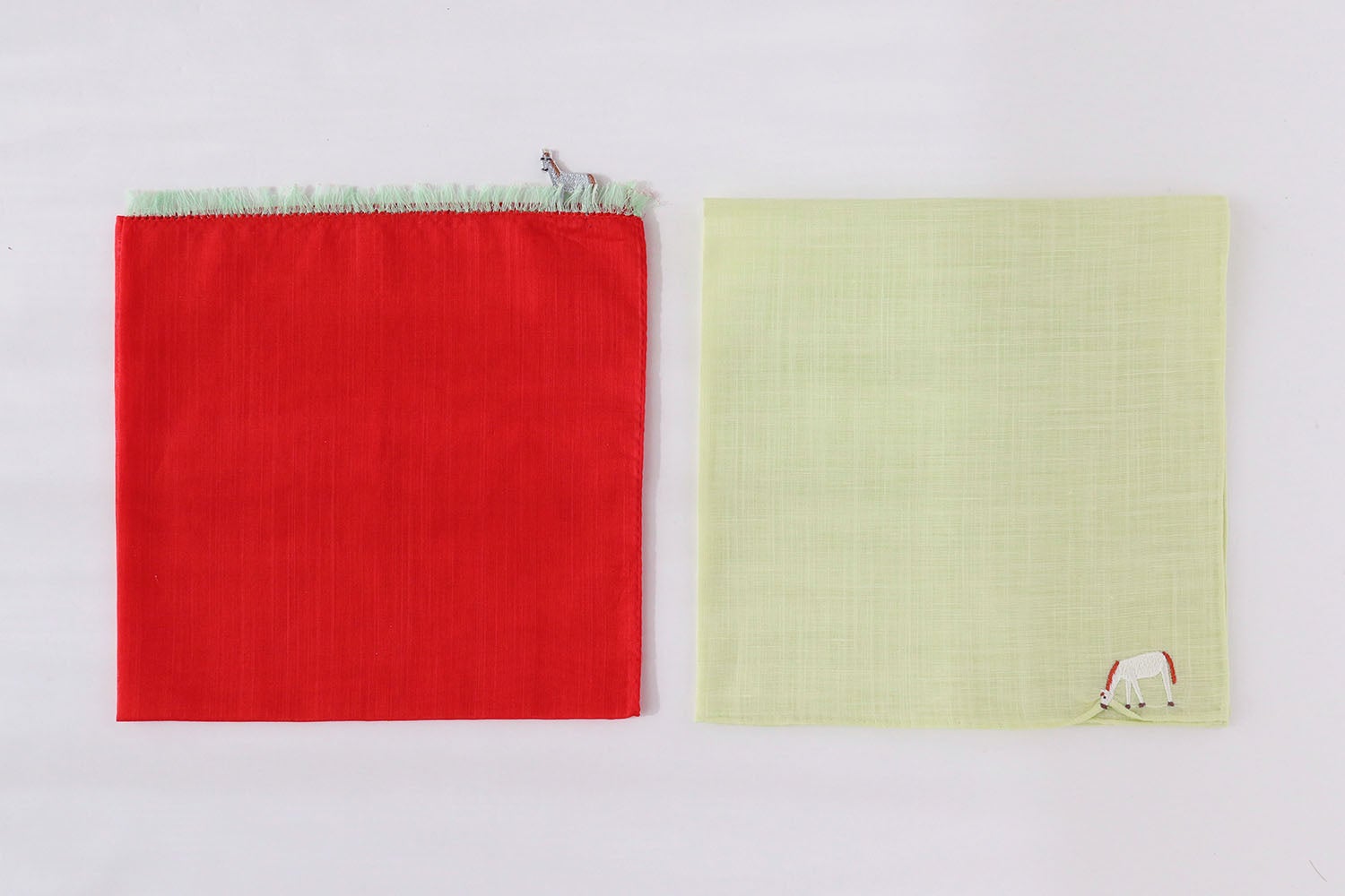 ハンカチの縁を草むらに見立てその中に一頭の馬を刺繍で表現しました。お馴染みの草むらシリーズの一つです。のんびり優雅に見える馬ですが、午年の午は活力、前進、飛躍の象徴とされています。2026年、新しい事へ挑戦し、勢いに乗り成功や繁栄を願うハンカチーフです。