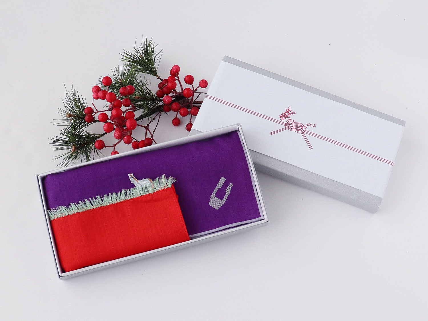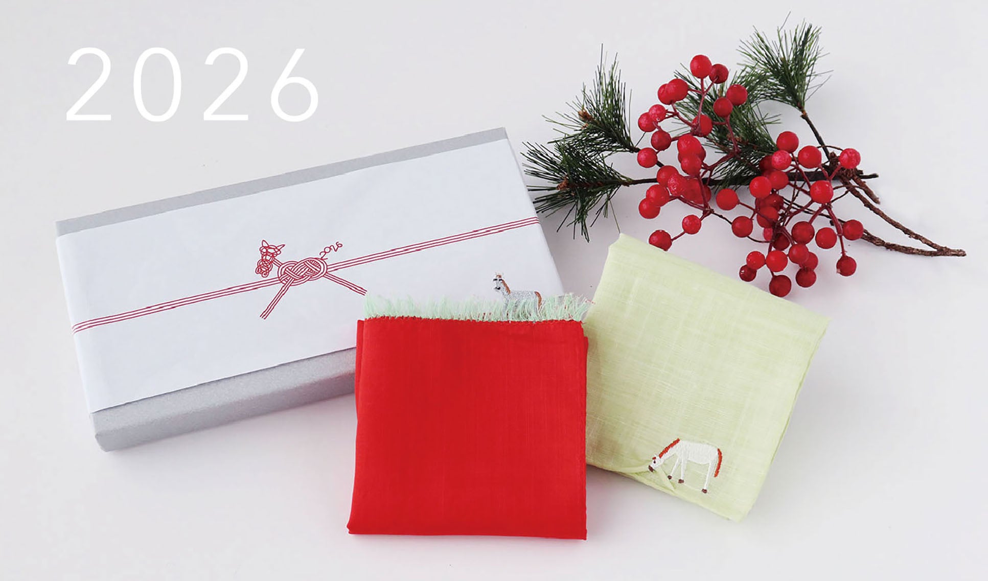 2026年の干支「午」をモチーフにデザインした、年末年始の贈りものにふさわしい特別な一枚です。日本の文化として根づく「干支」に願いを託した、縁起の良いハンカチーフが今年も登場します。