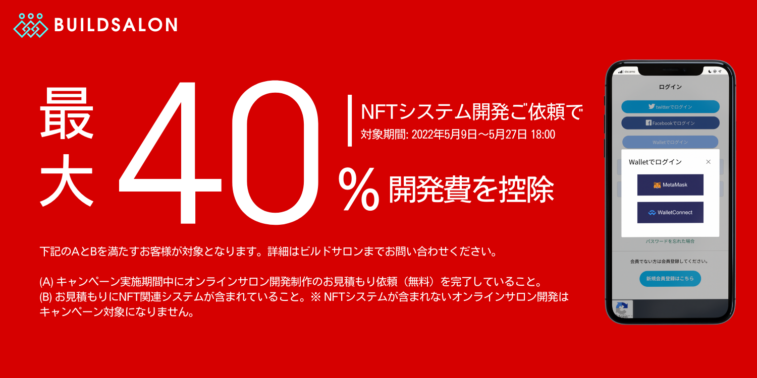 【5月27日まで・先着順】オンラインサロン × NFT関連システムの総開発費を、ビルドサロンが最大40%負担。ビルドサロンがNFT普及促進キャンペーンを実施【株式会社ビルドサロン】