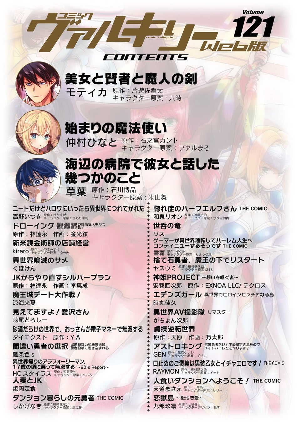 コミックヴァルキリーWeb版最新号Vol.121配信開始!巻頭は最新4巻が大好評発売中『美女と賢者と魔人の剣』!他TVアニメ化、TVドラマ化、人気Web小説のコミカライズなど多数の作品が好評連載中!