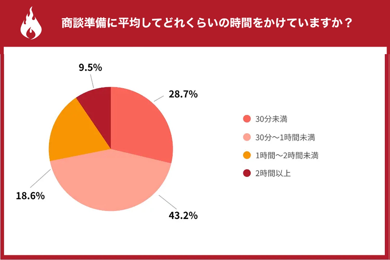 「商談準備に平均してどれくらいの時間をかけていますか。」(n=1,000)と質問したところ、「30分未満」が28.7%、「30分〜1時間未満」が43.2%となり、約7割が1時間未満で準備を終えていることがわかりました。