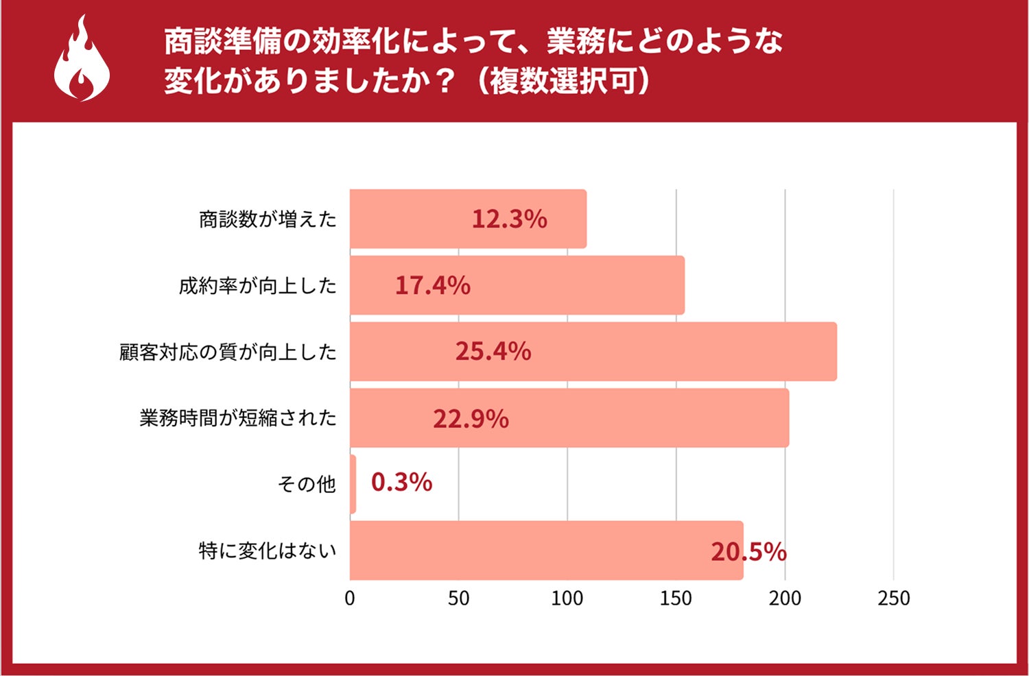 (n=668)と質問したところ、「商談数が増えた」が12.3%、「成約率が向上した」が17.4%、「顧客対応の質が向上した」が25.4%、「業務時間が短縮された」が22.9%という結果でした。一方、「特に変化はない」が20.5%にとどまり、約8割が業務改善を実感していることがわかりました。
