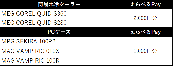 対象製品と、えらべるPayの金額対応表は以下になります。