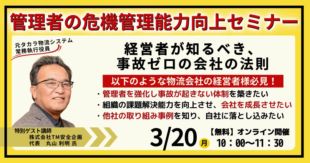 ロジスティクス・物流コンサルティングサービスを提供する船井総研ロジ株式会社(東京本社:東京都千代田区、代表:菅重宏、以下「船井総研ロジ」)は2023年3月20日(月)に物流会社・運送会社の経営者を対象とした「管理者の危機管理能力向上セミナー」をオンラインで開催いたしました。