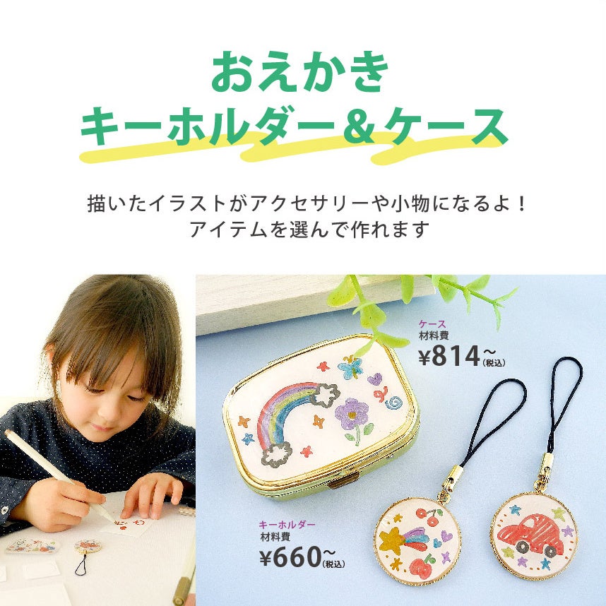 描いたイラストがアクセサリーや小物になるよ! ストラップ、小物ケースとアイテムを選んで作れます。