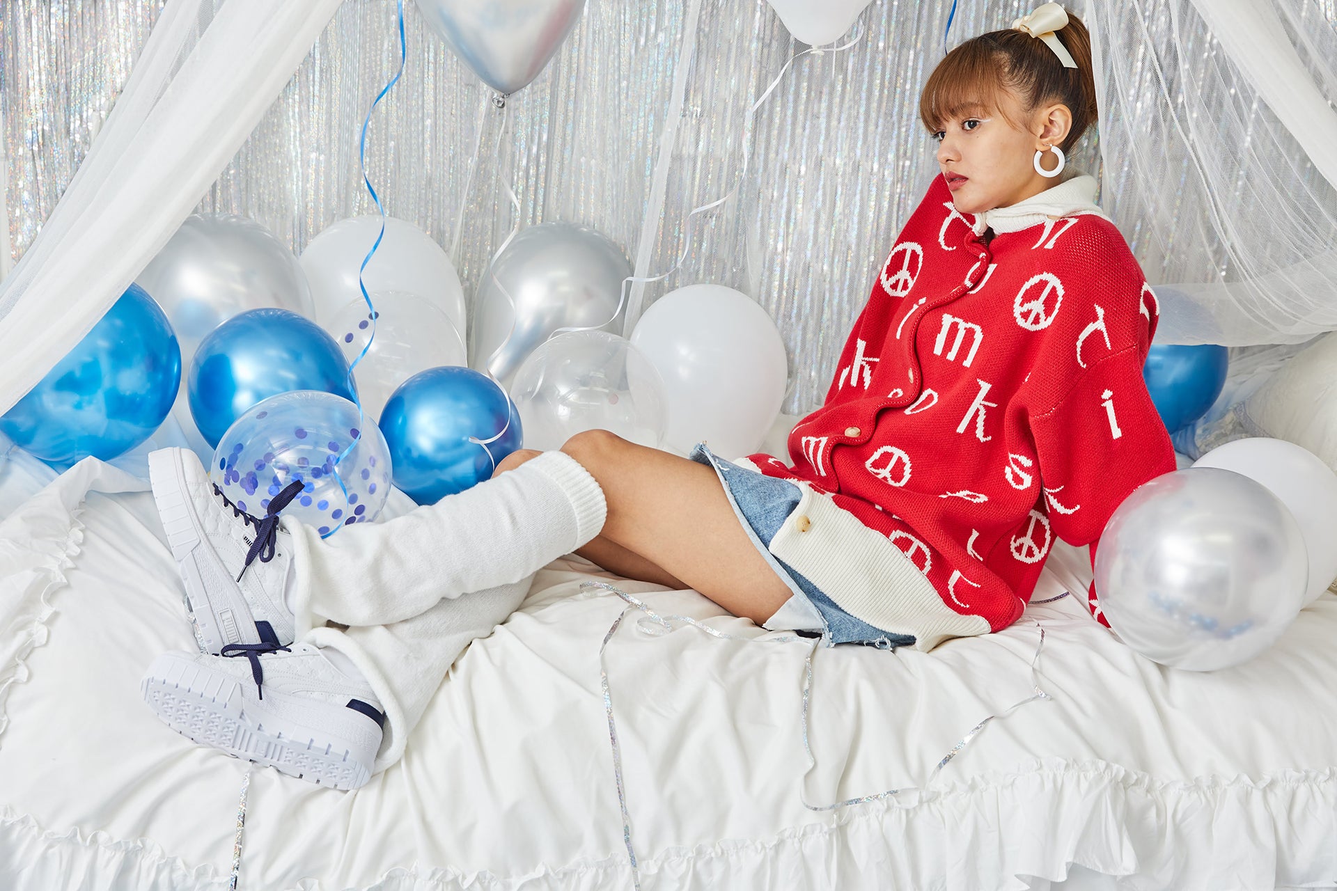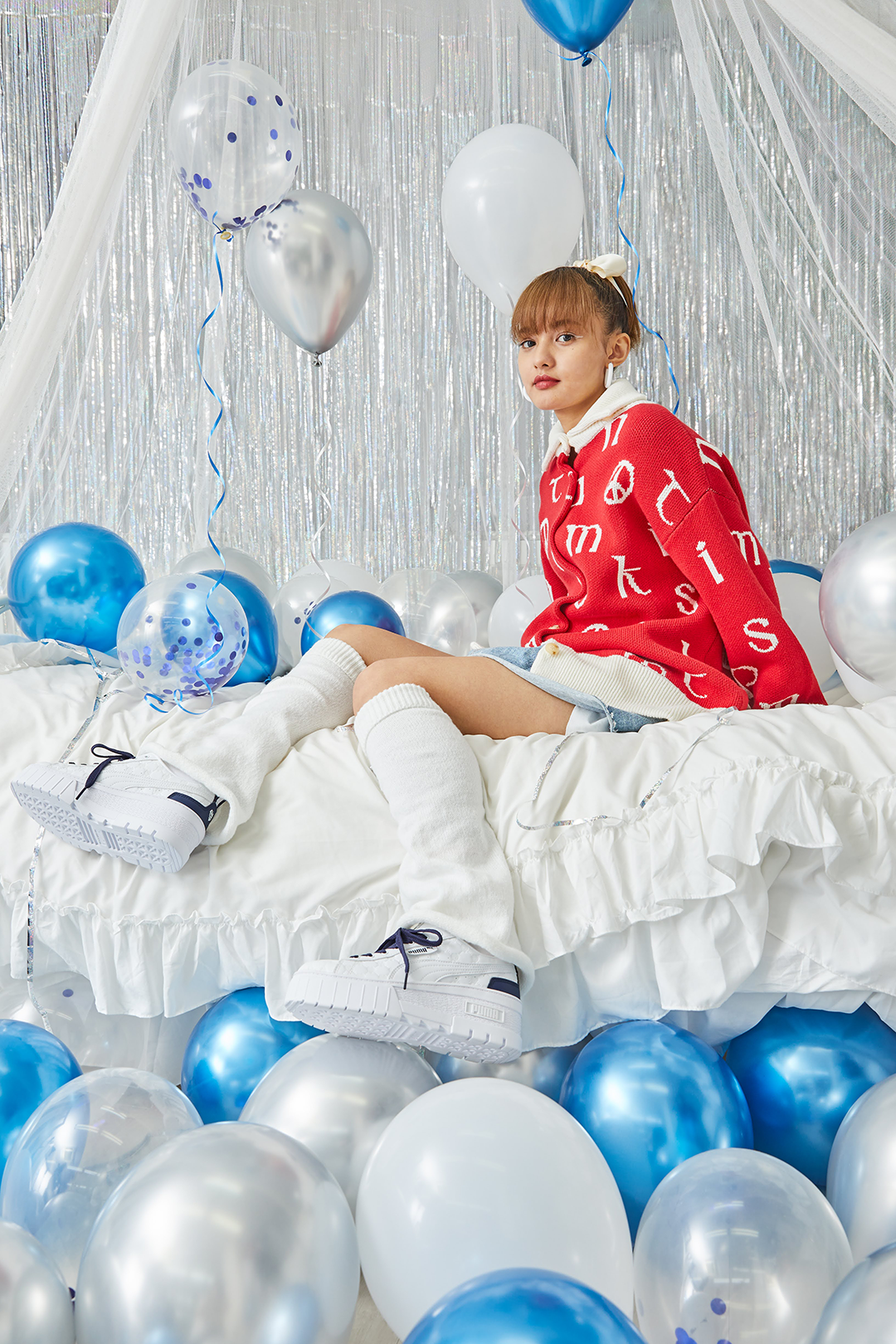 ホワイトをベースにネイビーとの配色はぱっと見クールな雰囲気ですが、atmos pinkのハートロゴがボディー全体にエンボス加工され、更にボディーだけではなくシュータン、ヒールカウンター、インナーソールと、ハートロゴがふんだんに使われているコラボレーションならではのハートフルなスペシャルデザインが完成しました♡幅広いコーディネートにも合わせやすいカラーなうえにインソールのかかと部分に厚いウェッジソールを使用しており、PUMAの厚底スニーカーの中でも脚長&スタイルアップ効果のあるシルエットはいつも以上に女性らしさを格上げしてくれる一足です♪