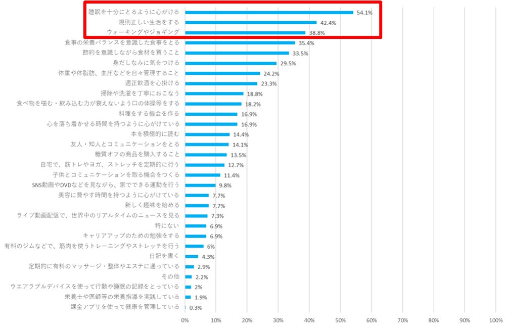 ・「現在行っている生活習慣で今後も続けたいこと」を尋ねたところ、1位は「睡眠を十分とるように心がける」(54.1%)となった。コロナ禍によるストレスや生活リズムの崩れにより、睡眠に課題を抱えている人が多いことが推察される。2位は「規則正しい生活をする」(42.4%)、3位は「ウォーキングやジョギング」(38.8%)となった。コロナ禍で在宅時間が増えたことで、生活リズムが崩れたことを自覚している人も多く、「十分な睡眠」「規則正しい生活」「運動」といった自身の健康を守るための生活習慣が定着していくと考えられる。