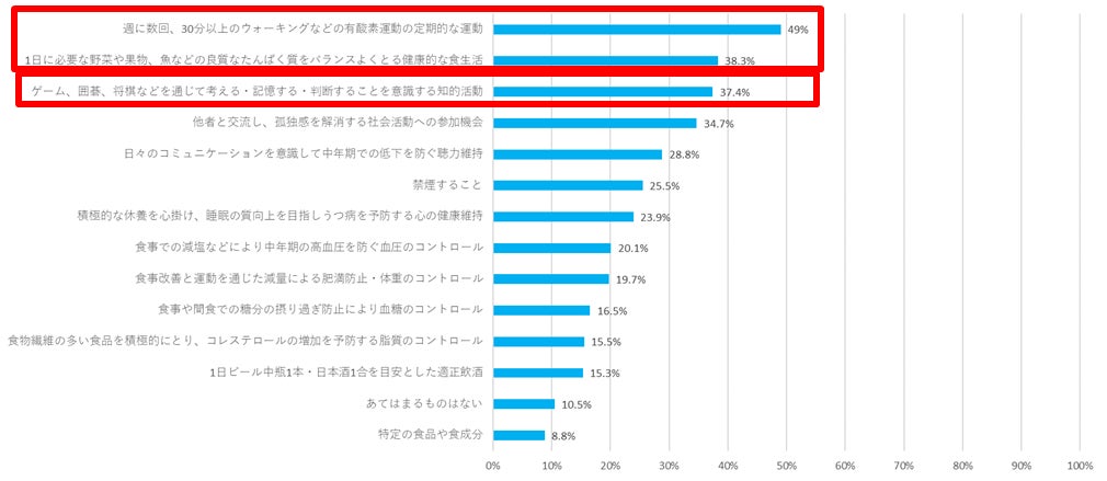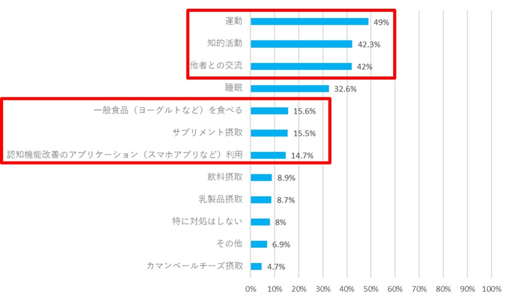 ・一般食品やサプリメント摂取など、食品摂取で対処しようとする人、認知機能改善のアプリケーション利用も約15%となった。