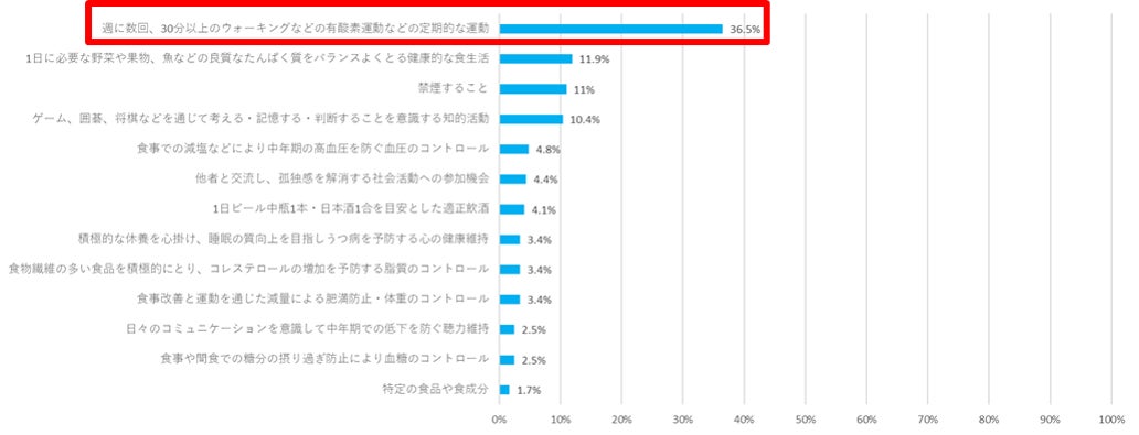 ・認知機能維持に効果があると知られる活動の中で、実際に長く取り組んでいるのは、ウォーキングなどの適度な運動という回答が36.5%。その他の項目は、取り組みが効果的であるとは知っているものの、取り組みの継続に課題があると推察される。
