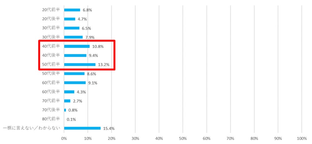 ・「認知機能(記憶力、言語能力、判断力、計算力、遂行力)の対策は何歳頃から取り組むべきか」を尋ねたところ、1位「一概には言えない/分からない」、2位「50代前半から」(13.2%)、2位「40代前半から」(10.8%)となった。各年代の回答を見ると、50代前半までは、今の自分の年代を回答するスコアが最も高かった。一方で、60代を超えると「50代前半から」など、今の自分よりも若い年代を回答するスコアが最も高くなることから、自身の認知機能の変化を50代後半に感じる人が増加する“50代後半の壁がある”ことが分かった。