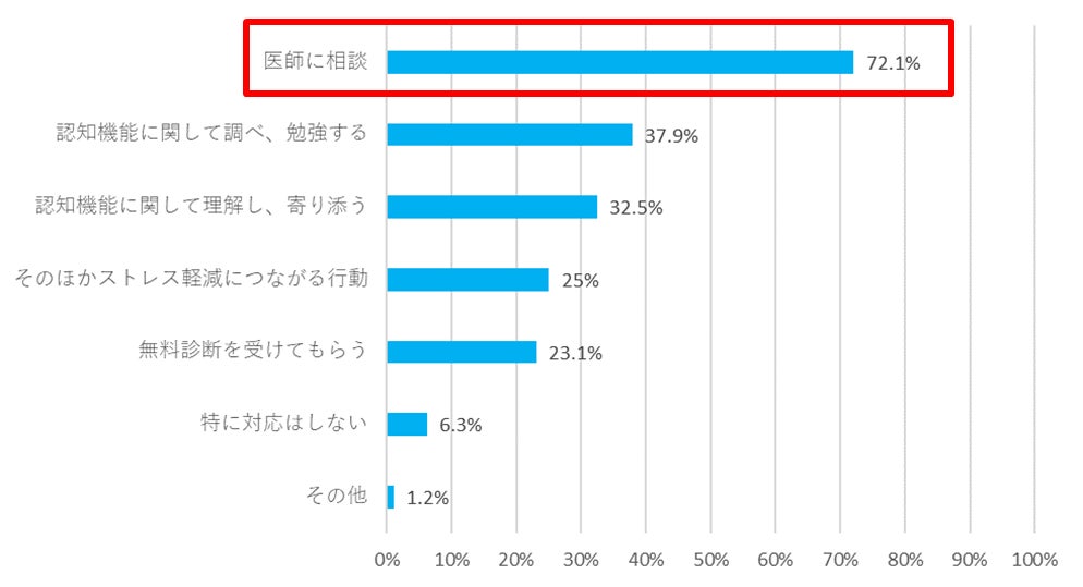 ・自分や家族に認知機能の低下がみられた場合、「医師に相談」と回答する人が72.1%となった。