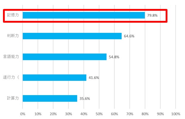 ・「今後低下すると不安な認知機能」については、1位「記憶力」(79.8%)、2位「判断力」(64.6%)、3位「言語能力」(54.8%)、4位「遂行力」(41.6%)、5位「計算力」(35.6%)となった。認知機能の中でも特に「記憶力」の低下に不安を感じている人が多いことが分かった。
