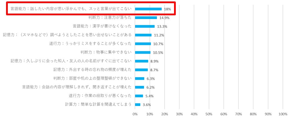 ・18%の人は「話したい内容が思い浮かんでも、スッと言葉が出てこない」と回答しており、認知機能の中でも「言語能力」の衰えを感じている。フリーコメントでは、「家族以外との会話時間が減少していること」を要因に掲げている人も複数おり、リアルなコミュニケーション機会が減少したことが一因と考えられる。口頭でのコミュニケーションを潤滑に行うために今後取り組みたいこととしては、「家族以外の人との会話を増やすこと」「思考を整理して話す練習をすること」などの回答が見受けられた。なお、当項目は、20代から80代まで全世代で約2割が選択しており、年代差が少ないことも特長。