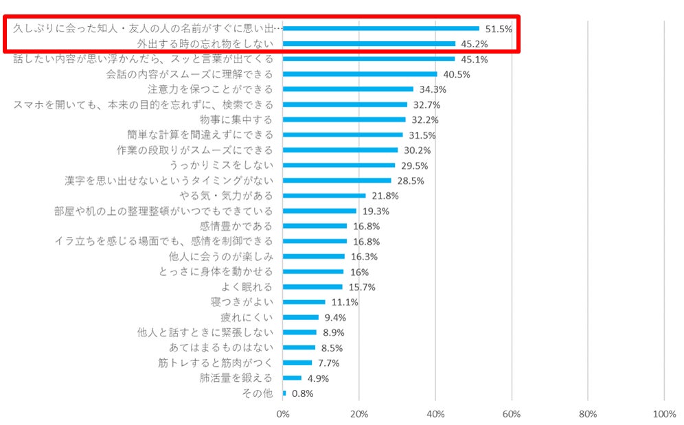 ・「久しぶりに会った知人・友人の人の名前がすぐに思い出せる」、「外出するときの忘れ物をしない」など、認知機能が記憶力において役割を果たしていると考える人が多い。