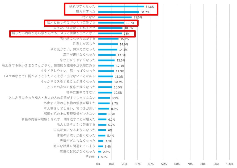 ・最近2~3か月とコロナ禍以前を比較した際に自身が感じる変化として、1位「疲れやすくなった」、2位「筋力が落ちた」と、いずれも約3割の人が自身の身体の健康についての変化を感じている。4位「他人と会うのをおっくうに感じる」と、19.7%の人が回答した。6位「話したい内容が思い浮かんでも、スッと言葉が出てこない」と、18%の人が認知機能の中でも言語能力の衰えを感じると回答した。