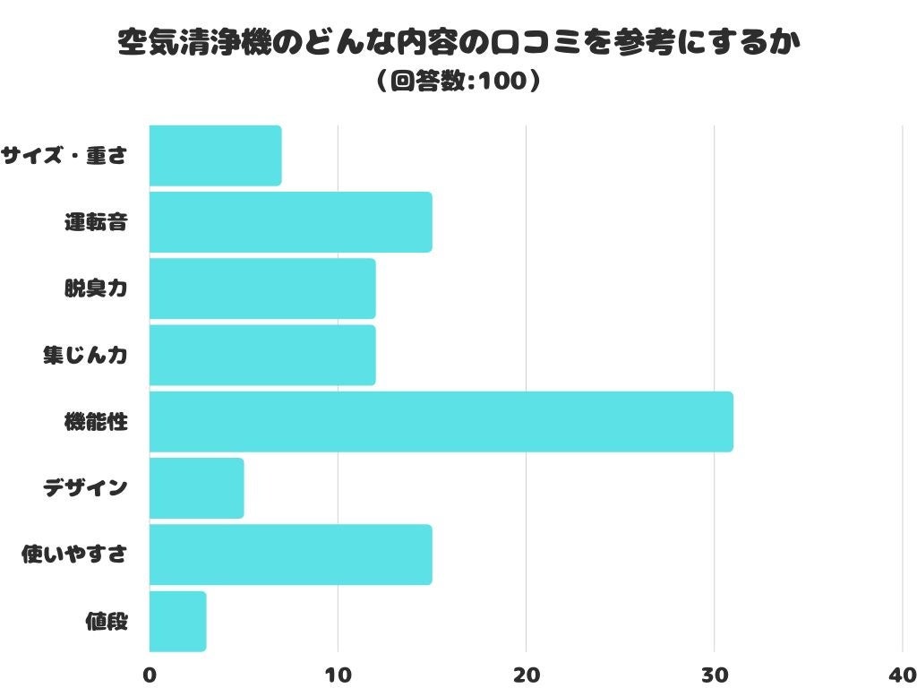 空気清浄機のどんな内容の口コミを参考にするかをアンケートにて調査したところ、1位は「機能性」でした。