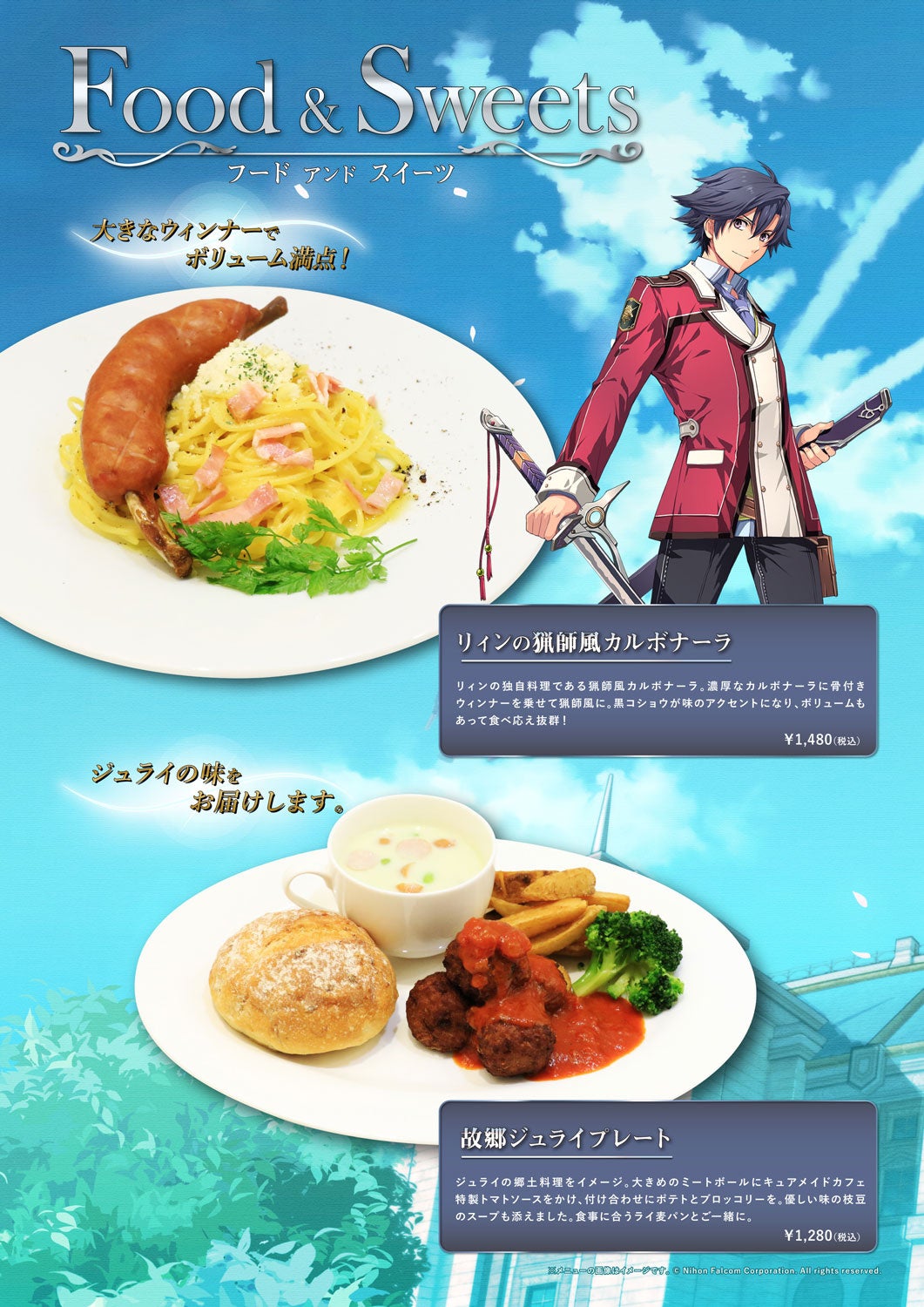 特科クラス《Ⅶ組》の面々をイメージしたドリンク全11種に加えて、リィンの独自料理である猟師風カルボナーラや『閃の軌跡IV』エンディング 結婚式の披露宴をイメージした華やかなプレート「大団円~未来へ~10thアニバーサリープレート」などずらりとコラボメニューがラインナップいたします。